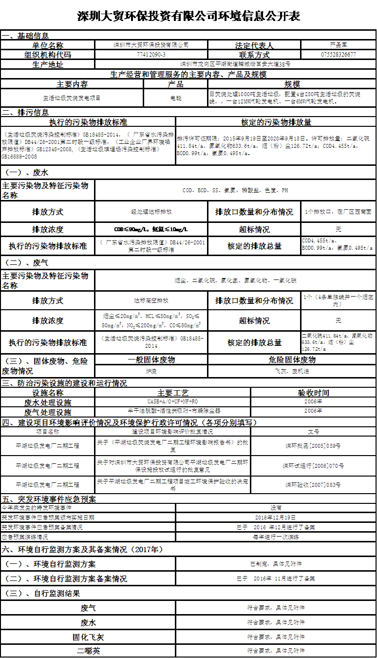深圳天楹環(huán)保能源有限公司2017年環(huán)境信息公開表